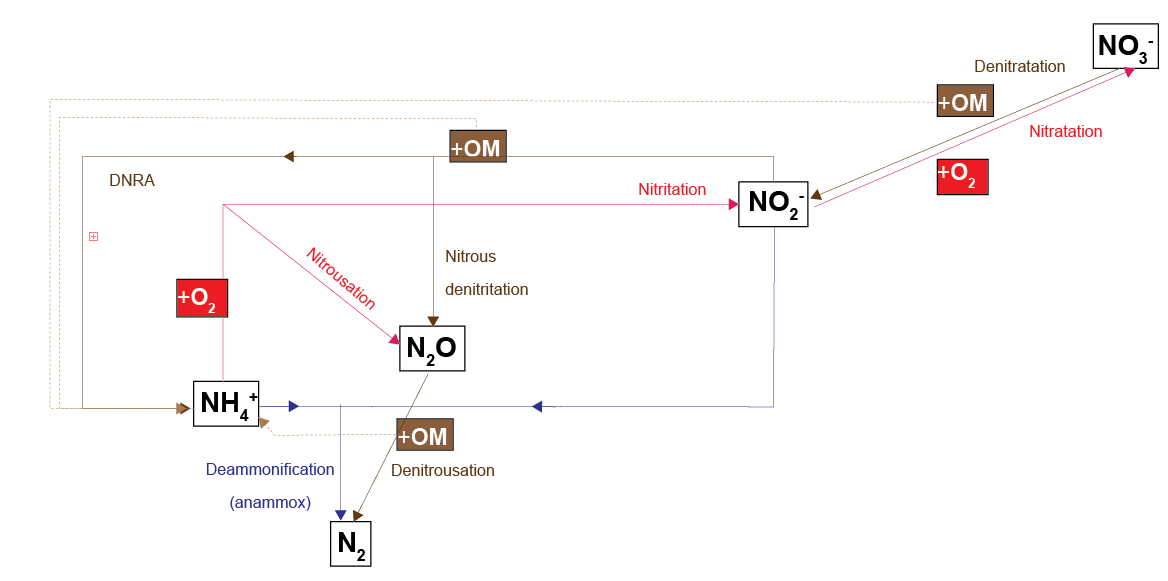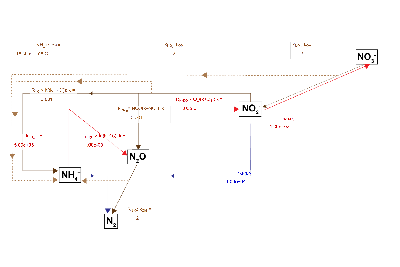Figure 8. The N redox model used in CANDI-AED. Red pathways indicate oxidation by \(O_2\), brown pathways oxidation of organic matter by an N species and the blue pathway is \(NH_4^+\) oxidation by NO2-. Dashed brown lines indicate the release of NH4 from organic matter upon oxidation.