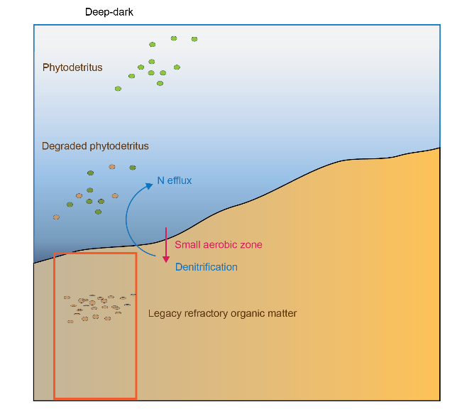 Legacy refractory organic matter was oxidised by sulfate reduction in the deep sediments below the aerobic zone, and H2S production was indicated by the cores, but not measured.