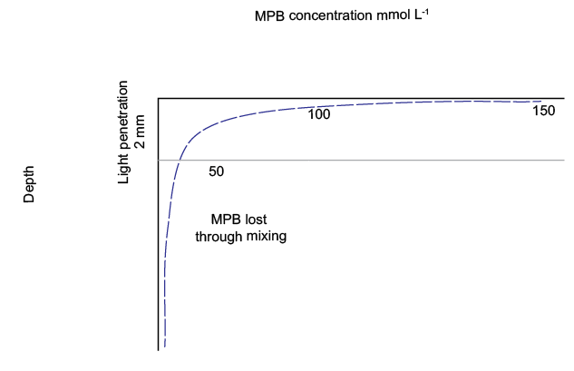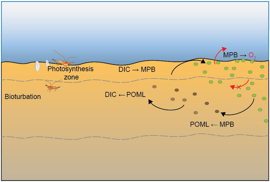 Redox pathways: The NPP provided \(O_2\) in the top 2 mm of the sediment, which maintained aerobic respiration. The extra organic matter from \(MPB\) biomass consumed oxidants as well, which allowed for more N redox reactions and sulfate reduction than in the Deep-dark sediments (Figure 10.23).