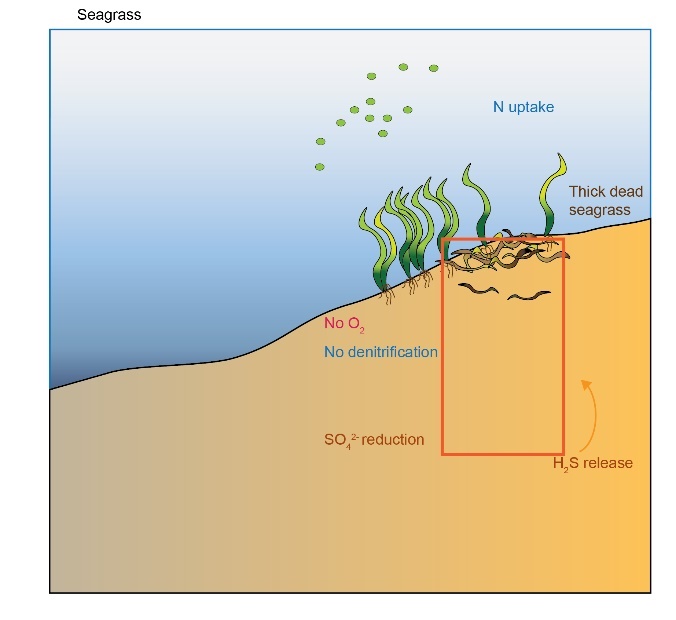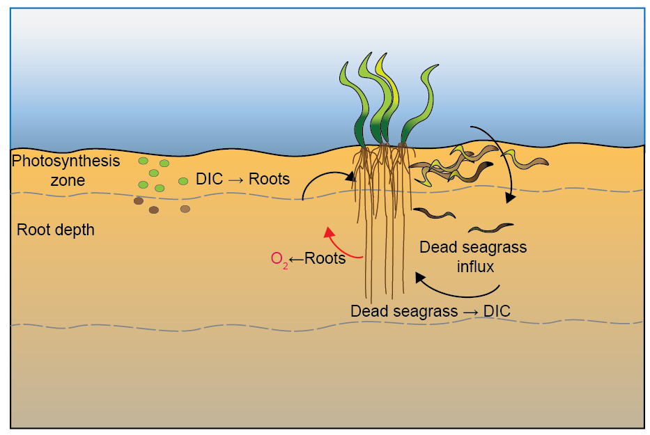 Figure 11 Photosynthetic aerobic conceptual model for shallow sediments, including seagrass and microalgae.