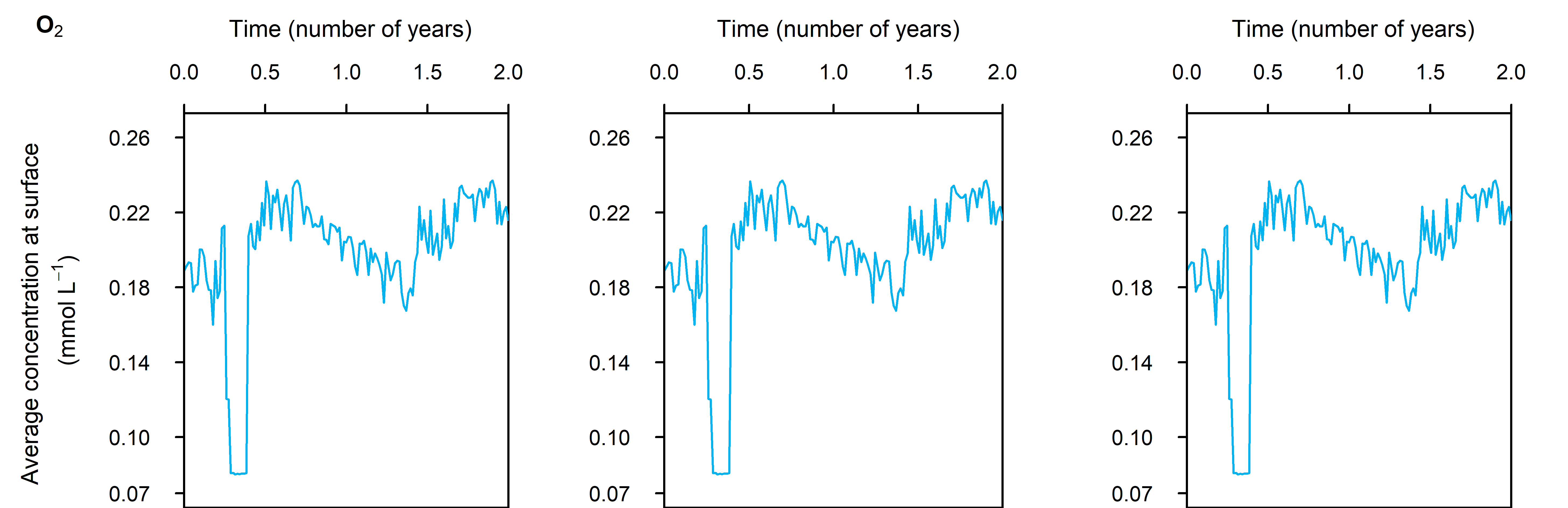 Sediment \(O_2\) concentration recovered very quickly after the boundary \(O_2\) concentration returned. This is a result of the high mixing rate that was calibrated in the initial steady Deep-dark setup. If the boundary \(O_2\) drop was the result of less mixing with the atmosphere, the mixing through the water column and at the sediment-water interface may have also been less, and the recovery might have been slower. This would be another experiment that a coupled sediment-water column model could investigate.