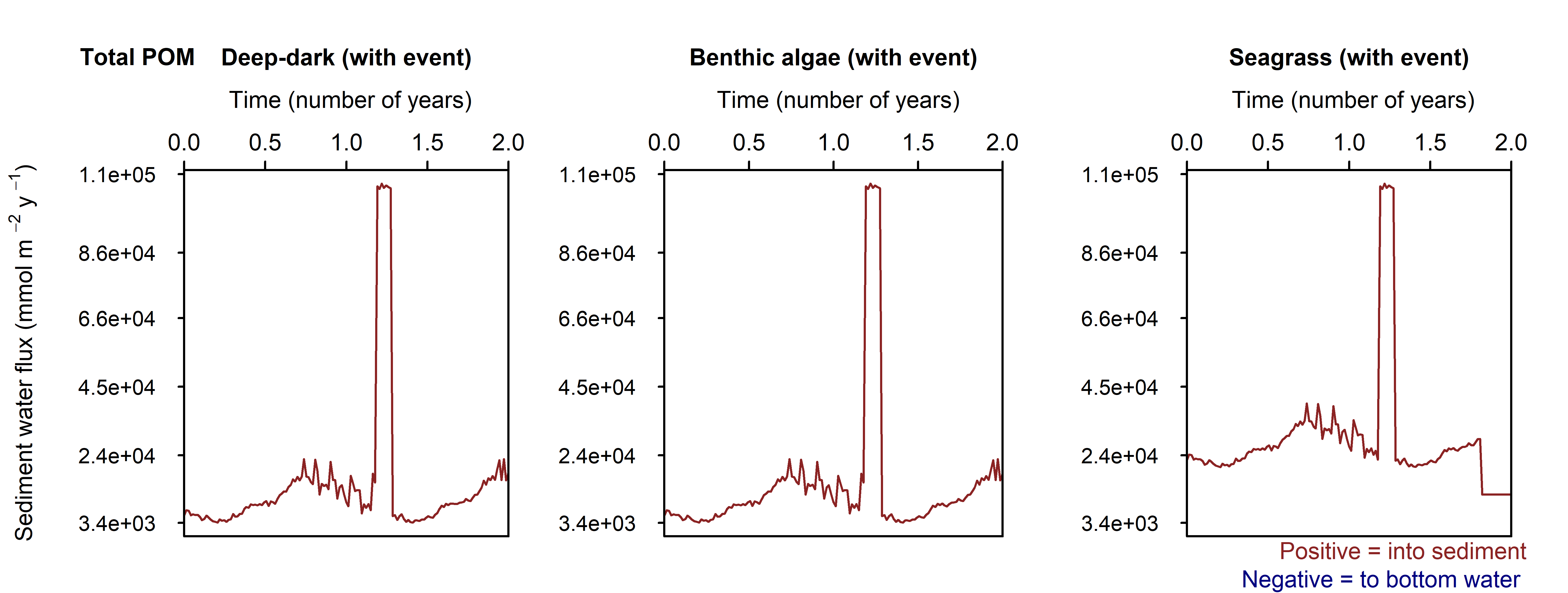 The one-off increase in organic matter concentration created a bigger flux of \(O_2\) into the sediment in the case of the Deep-dark and Benthic algae environments, and a smaller flux to the bottom water in the case of the Seagrass environment (Figure 10.40). The recovery after the event was slower than in the \(O_2\) drop simulation, because the extra organic matter was buried as a solid, rather than diffused as a solute.