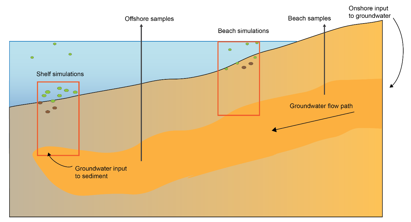 The simulations with groundwater brought more DIN and led to greater NH4+ flux, rather than NO3-. Much of the DIN was denitrified to N2 but there were still greater overall DIN fluxes to the water column from those areas with groundwater intrusion.