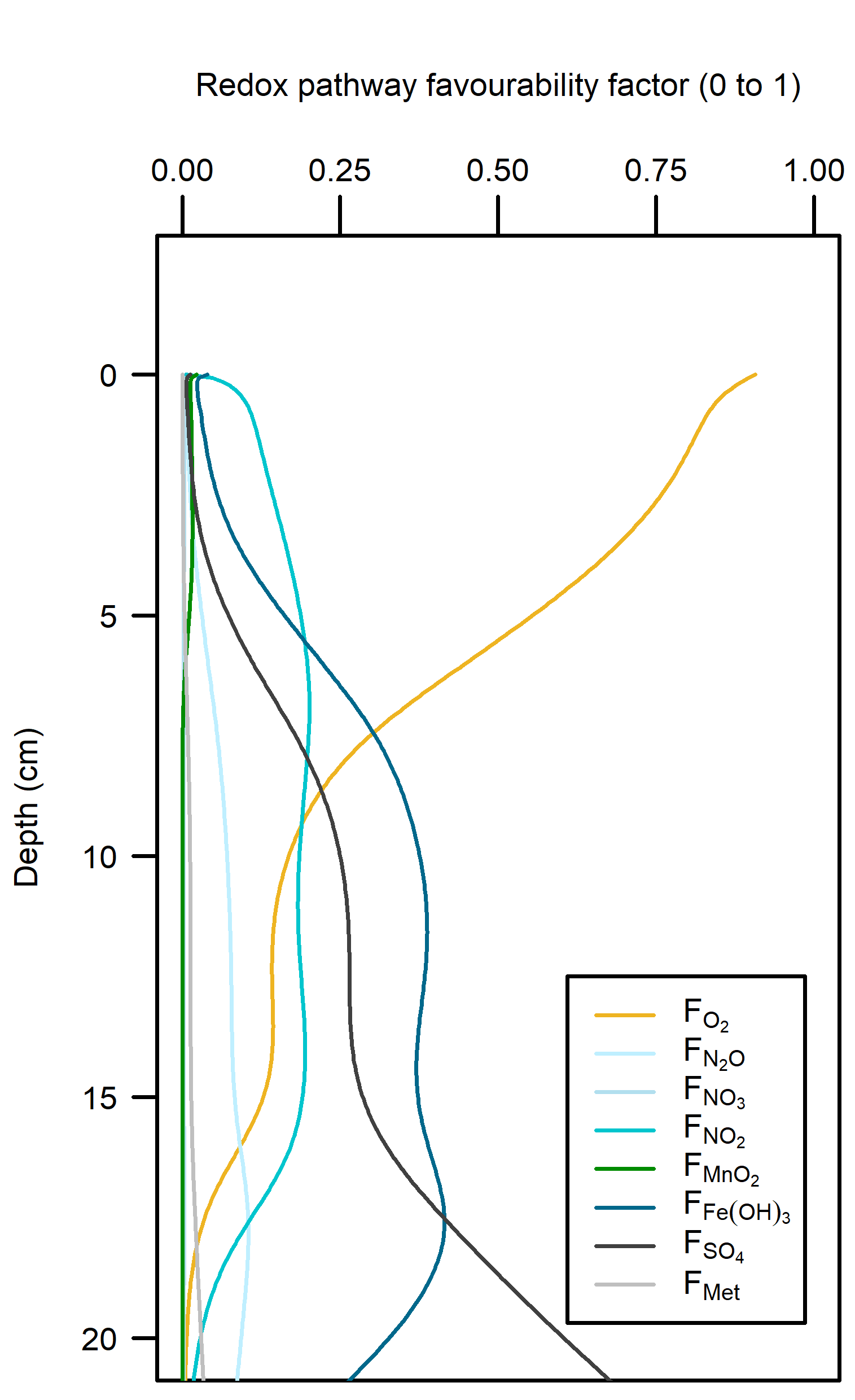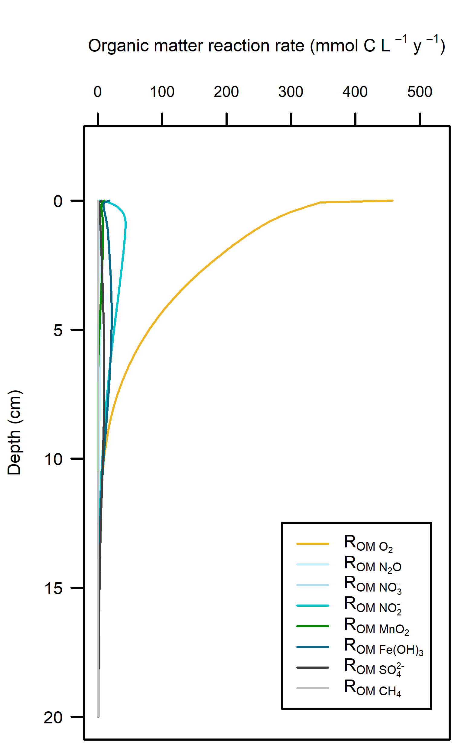 Redox pathways: With a large amount of \(O_2\) mixed into the sediment, this inhibited the other redox pathways (Figure 16). Beneath the depth of \(O_2\) penetration, organic matter supply had been mostly exhausted and so the other pathways did not have high reaction rates.
