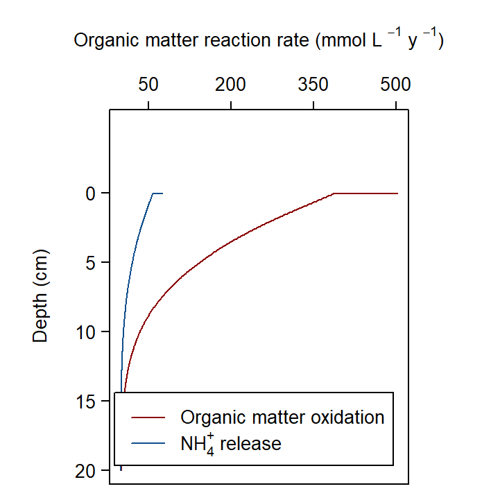Figure 10.22. Depth profile of organic matter oxidation and \(NH_4^+\) release in the steady Deep-dark simulation