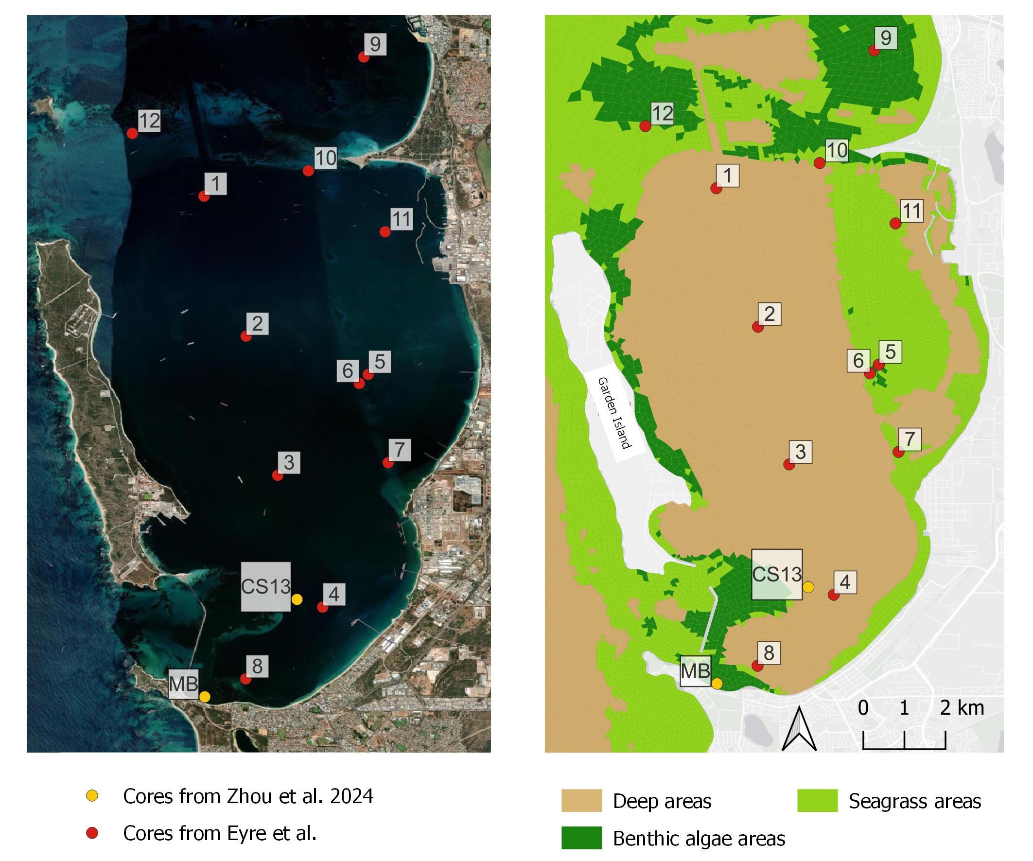 Eyre et al. (2025) collected 12 cores for incubation experiemnts, and four were in deep areas and eight in shallow areas. Two shallow sites (7 and 8) did not have seagrass. Core descriptions indicate that most sediments are sandy, with well-mixed upper 10 cm, and grey with occasional black patches, consistent with limited sulfate-reducing “muddy ooze”. The cores collected by Zhou ey al (XXXX) were also considered and theri (CS13) core was spatially close to one of the Eyre et al. (2025) deep muddy cores, while their (MB) core was close to one of Eyre’s shallow cores, providing a useful cross reference.