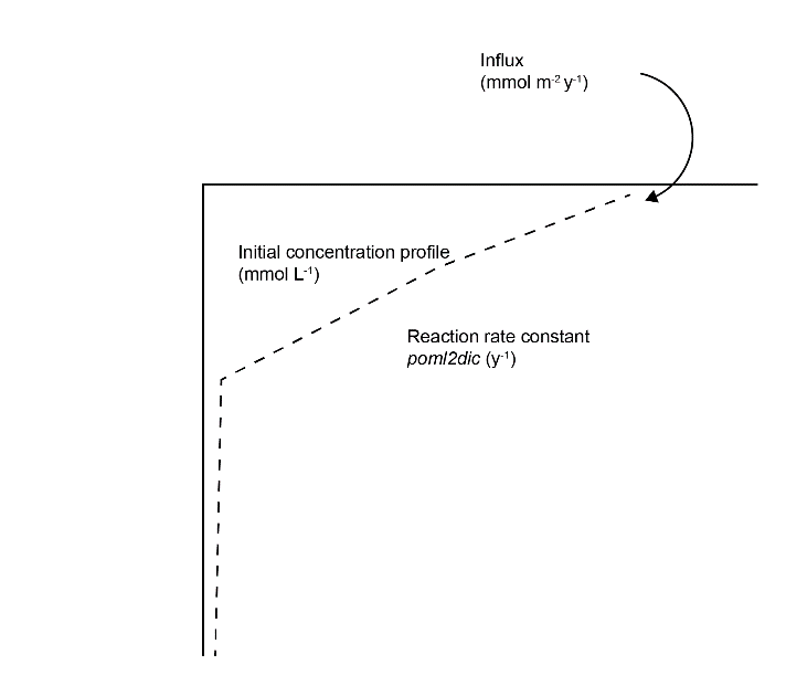 Figure 10.5. Illustration of the three major calibration inputs for organic matter: POML influx, the initial concentration profile and the kinetic reaction rate constant.