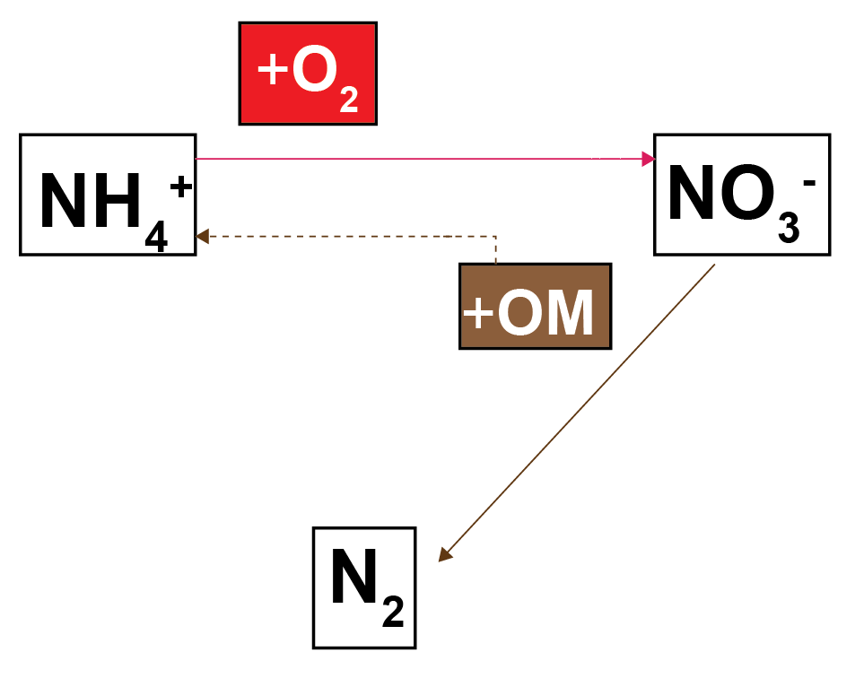 Figure 10.26. N redox pathways for each of the environments. Pathways of organic matter oxidation by N are shown in brown dashed lines and N oxidation by \(O_2\) are shown in red solid lines.