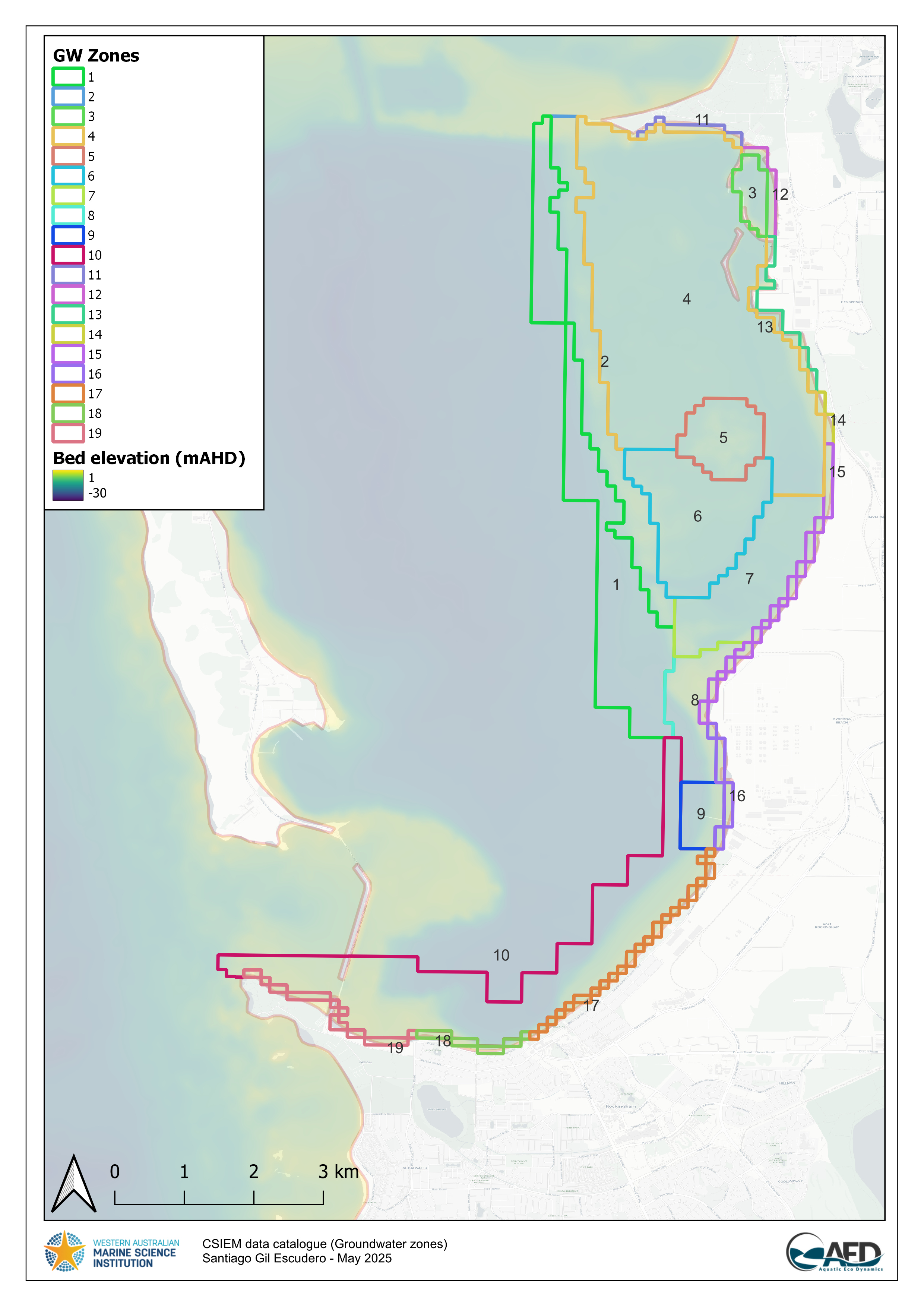 To spatially organize the input conditions in Cockburn Sound, a set of groundwater input zones, referred to as “GW zones” in the modelling workflow, were delineated. These zones group MODFLOW pixel-level data into larger hydrologically coherent areas and serve as boundary condition units in the CSIEM framework. Delineation was based on spatial groupings of groundwater discharge magnitudes. Each zone is associated with a polygonal shapefile and includes attributes such as area, average groundwater inflow, and assigned nutrient concentrations (Figure 8.3).