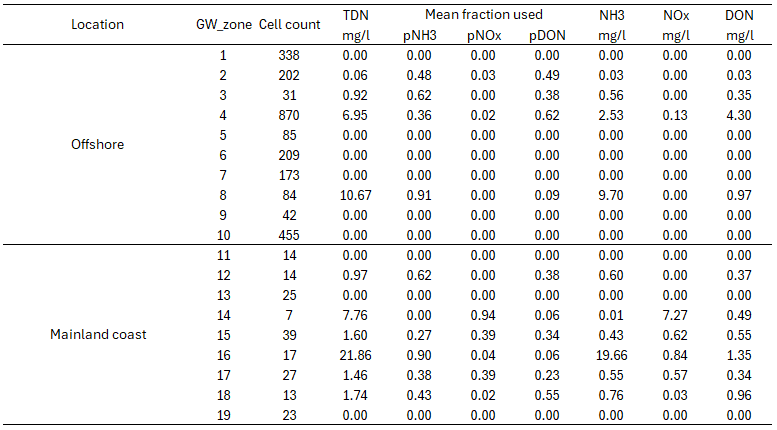In addition, the nitrogen speciation dataset provided by CSIRO was incorporated to define representative fractions of the main nitrogen species for each GW zone: ammonium (pNH₄⁺), nitrate/nitrite (pNOx), and dissolved organic nitrogen (pDON) (Donn et al. ,2025). The dataset comprises 2,669 model cells that were aggregated to the 19 GW zones. For each monthly timestep, the total nitrogen load (TDN) supplied by the CISRO mixing model outputs was multiplied by these zone-specific fractions, yielding species-resolved loads while preserving mass balance species (see Table 8.1). Each species load was subsequently normalised by the corresponding groundwater discharge and converted to concentrations (mmol/m³). These concentrations form the groundwater boundary conditions applied in the CSIEM surface hydrodynamic model, ensuring consistency between the nutrient loads and the concentrations represented in the system.