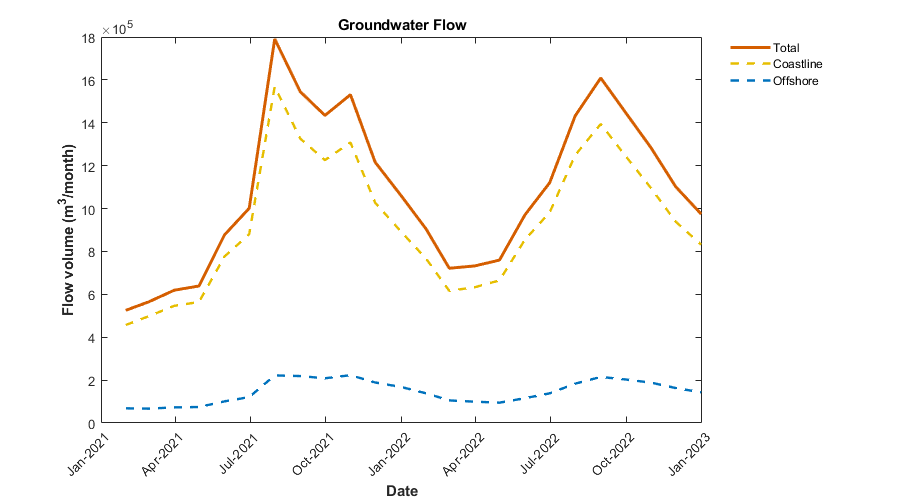Figure 8.4. Time series of total groundwater flow (Q), grouped by coastal (beach) and offshore (shelf) regions.