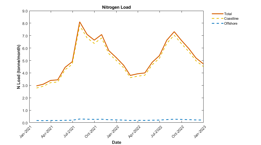 Figure 8.5. Time series of total groundwater nitrogen load (N Load), grouped by coastal (beach) and offshore (shelf) regions.