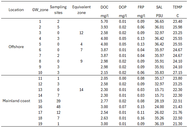 Representative porewater data for each GW zone were incorporated. Key water quality parameters such as DOC, DOP, total phosphorus, salinity and temperature, were available from porewater sampling sites distributed across Cockburn Sound (see Figure 8.6). The site data was mapped to each GW zone via the porewater sample locations, giving 138 unique IDs. Annual means were calculated by zone, and zones with no available porewater sampling information were filled using values from nearby or equivalent zones. The mapping of porewater sample locations (138 IDs) to GW zones and the calculation of annual zone-level chemistries are implemented in GW_BC_masterfile.m, using samples_guide.csv as a curated lookup. The respective constants used in each of the GW Zones are presented in Table 8.2.
