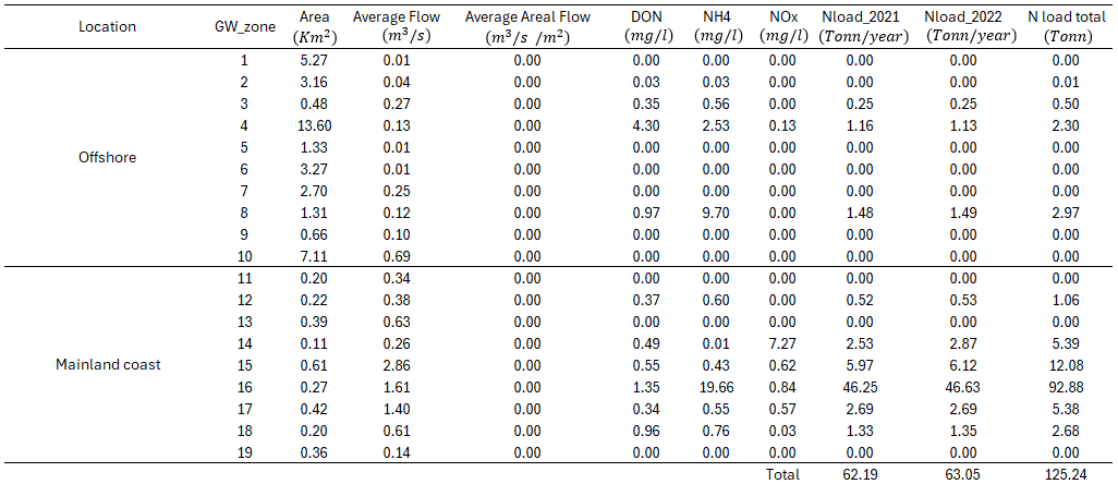 After processing the results of the MODFLOW groundwater model, the results were transformed into a format suitable for incorporation by the TUFLOW FV hydrodynamic model. To this end, a boundary condition dataset was generated that specifies the time-varying groundwater fluxes and the associated nutrient concentrations for each GW zone (converted to mmol m⁻³ for model input). Zone-specific boundary condition files (SGD_zone*.csv) were generated in GW_BC_creation.m. To extend the temporal coverage and support the long-term simulations, the original dataset (2021-2022) was used to span the period from 1980 to 2024, preserving seasonal patterns and allowing for consistent nutrient forcing over the entire model time frame. The temporal extension from the observed 2021–2022 record to the full 1980–2024 window is performed using the script GW_BC_file_loop.m. These boundary condition files were incorporated into the model through the groundwater boundary condition control file gw_PRAMS_19800101_20241201.fvc, together with the groundwater zone polygons defined in groundwater_zones_v3.shp. A summary of the delineated infiltration zones, including their surface area, mean flow (m³/s), areal mean flow (m³/s/m²) and applied mean concentrations of NH₄⁺, NOₓ and DON (mg/L), is presented in Table 8.3.