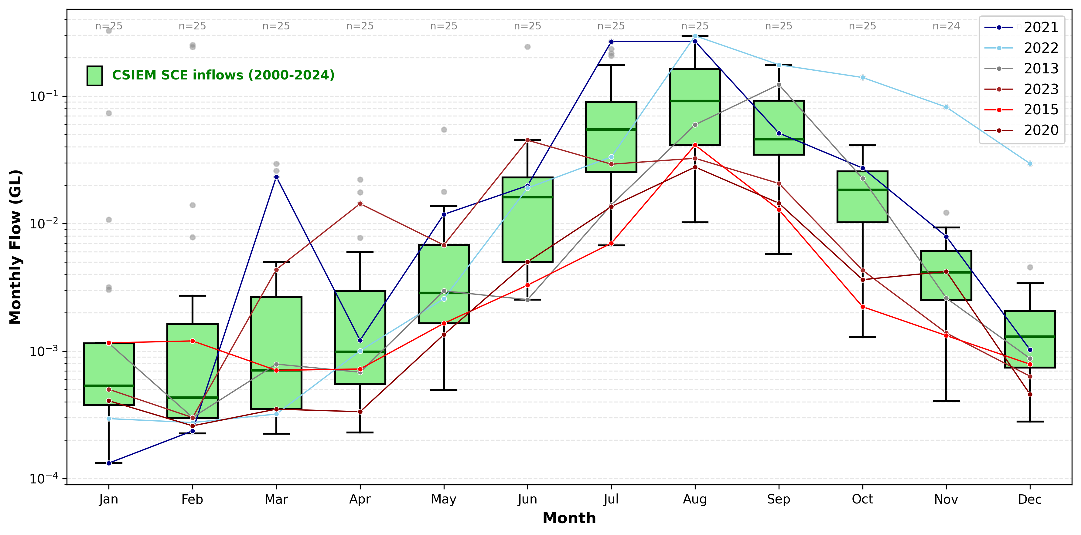 The CSIEM validation focus years are highlighted and shown to vary across the range of river flow conditions (dry, mid and wet), and years in which atypical summer flow events occur are marked. 2022 and 2021 are large flow years, even acorss the entire record, and 2015 and 2020 are very dry years. A monthly summary of the selected flow years is also presented to demonstarte the nature of each year relative to the long-term mean.