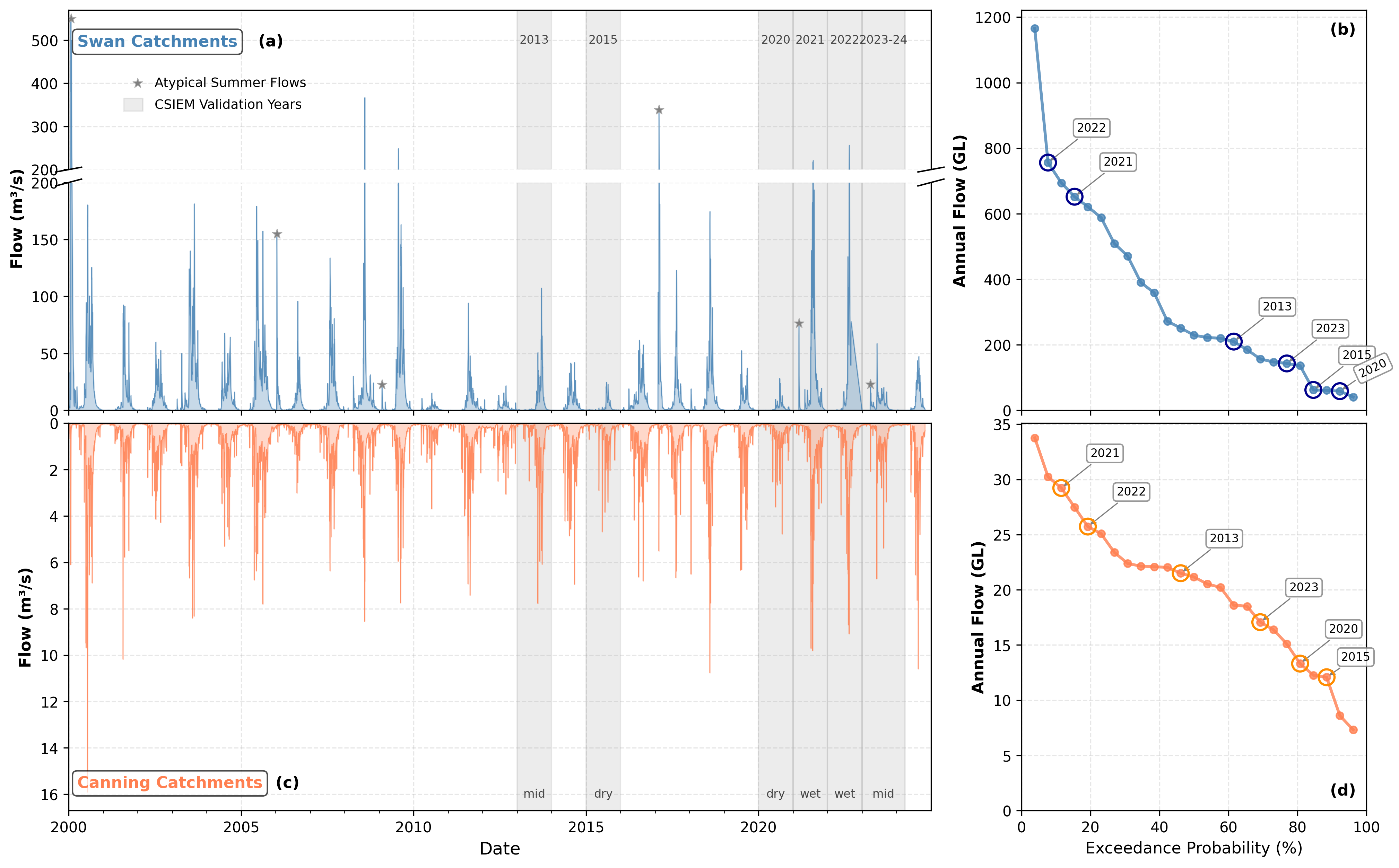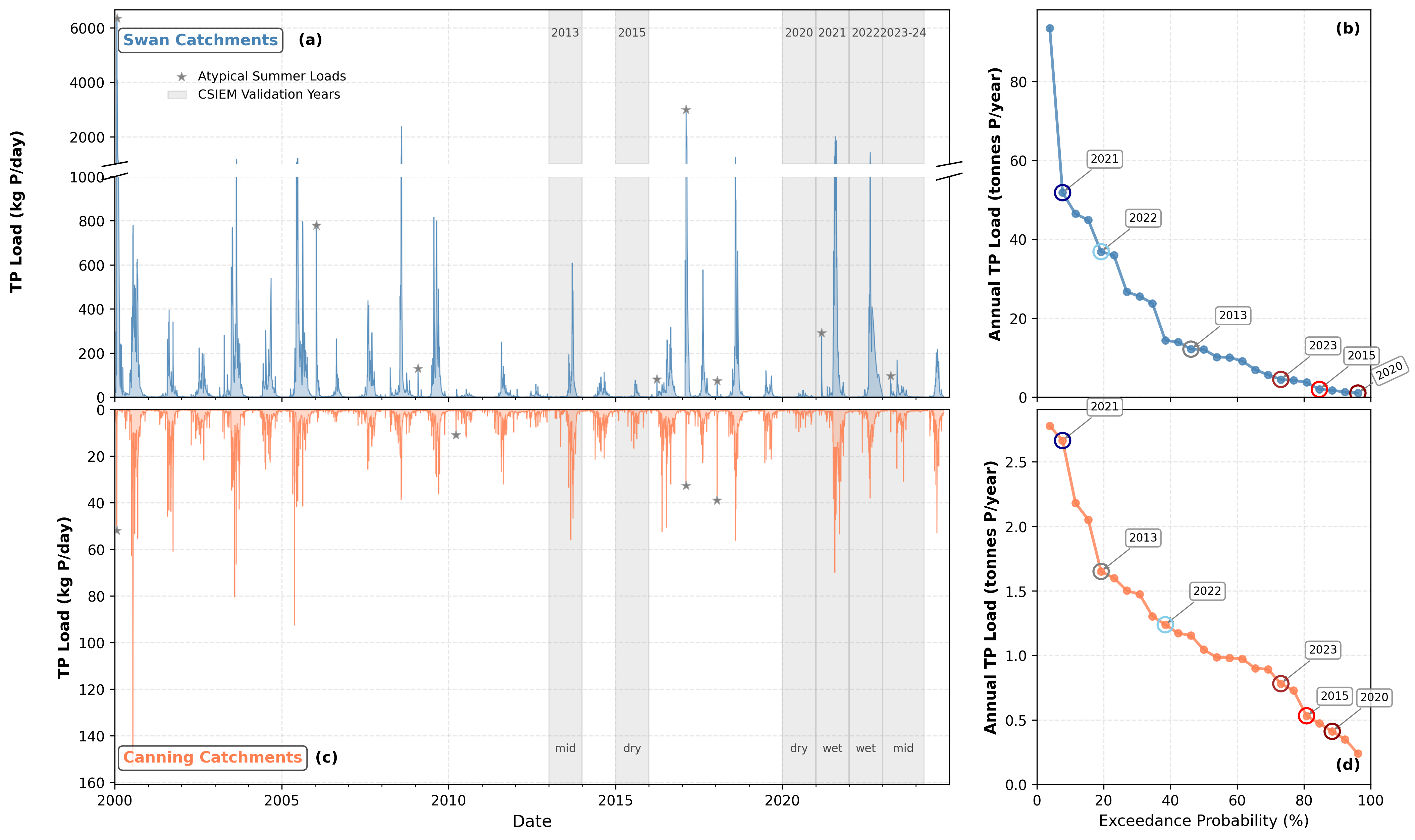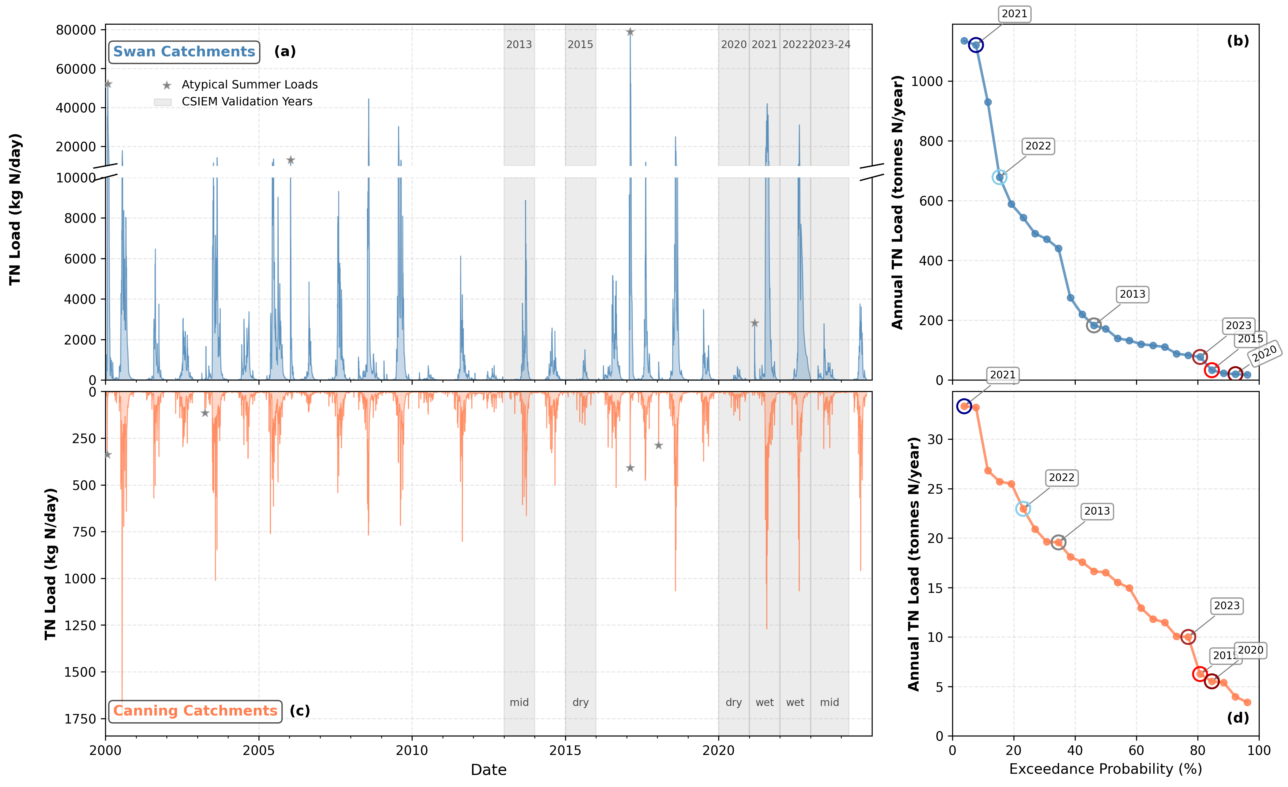 Integrated modelling of the Swan–Canning system has shown that interannual variability in freshwater discharge and nutrient export to the estuary is dominated by hydroclimatic forcing, with strong contrasts between wet and dry years, which is superimposed on a long-term drying trend. Simulations using the Swan Canning Catchment Model (SCCM) and Avon catchment model by Paraska et al. (2021) provides the most recent estimate of the total annual flows and associated nutrient loads. The model shows that they vary by factors of several between years, with discharge magnitude being the primary control on total nitrogen (TN) and total phosphorus (TP) export.