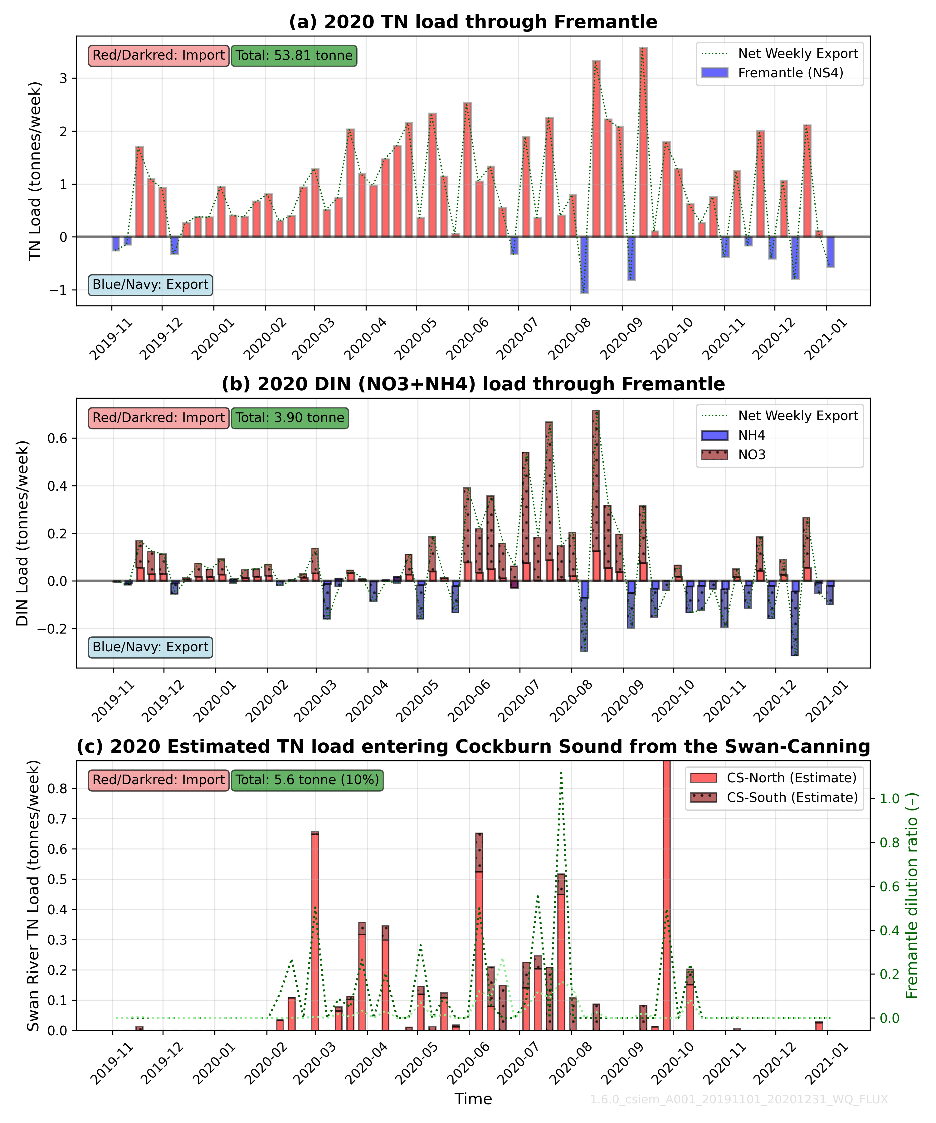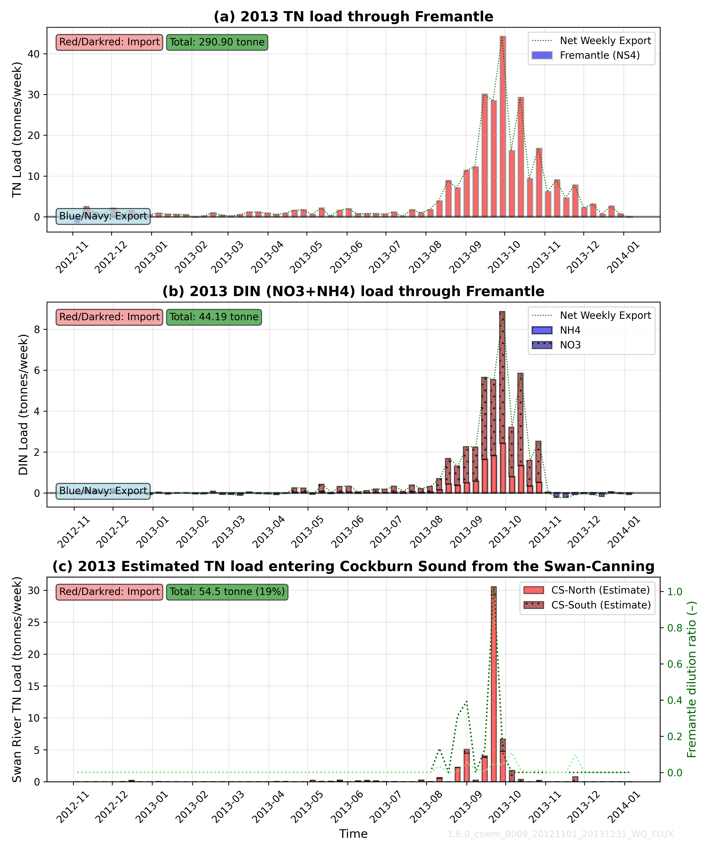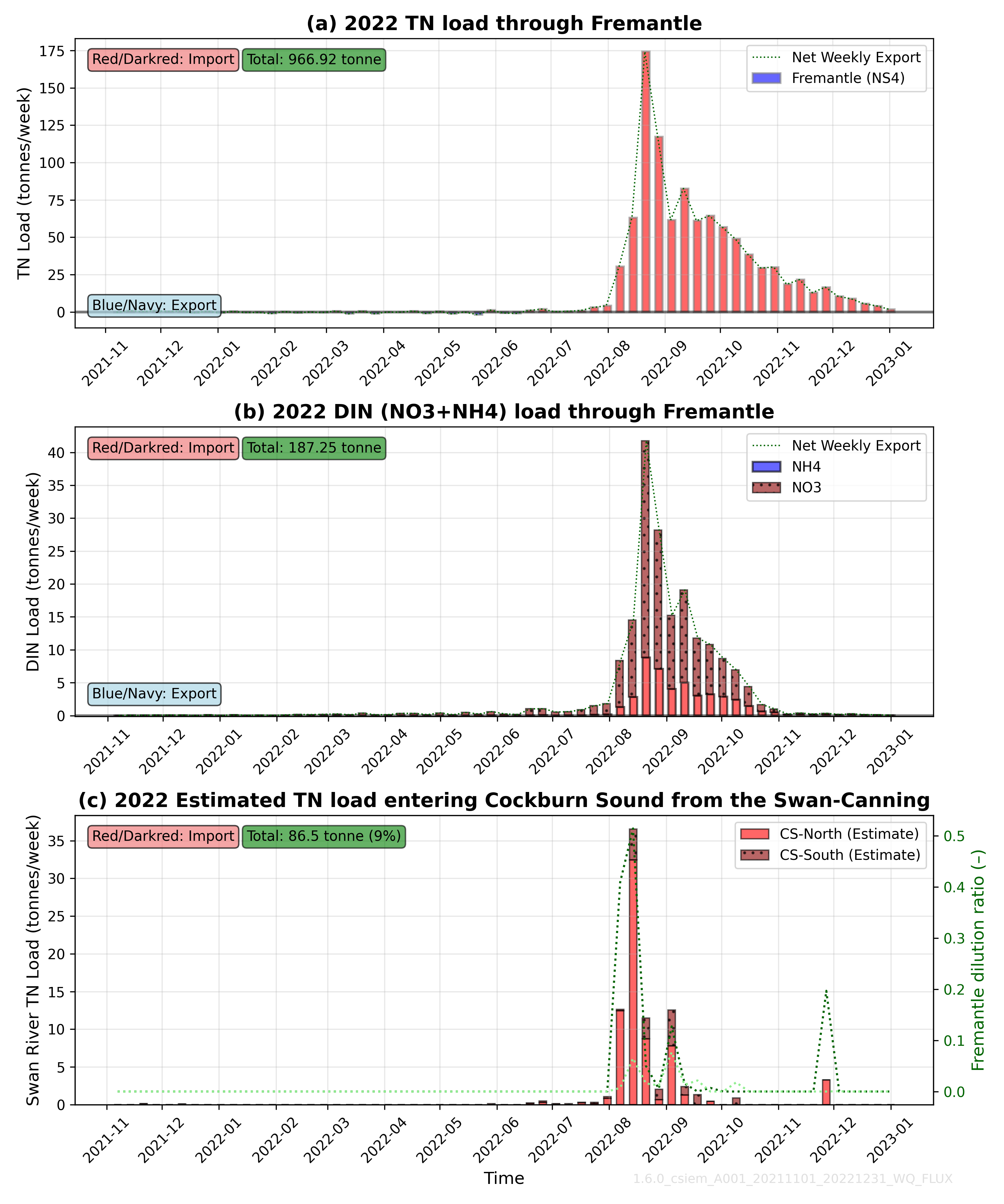 In the previous section, the tracer is used as an indicator of SCE nutrients to show the timing and relative magnitude of SCE waters making it to Cockburn Sound. In this section, we use the modelled flow and simulated nutrient concentrations from the biogeochemical model to compute the actual nitrogen load, enabling us to also consider the form of nitrogen. This is first computed for the water exiting SCE through the Fremantle Port, and then following on from the river tracer analysis, it is possible to also adapt this approach to compute the amount of river-derived nutrients leaving Fremantle that make their way into the main Cockburn Sound embayment (through the Woodman Point to Garden Island transect).