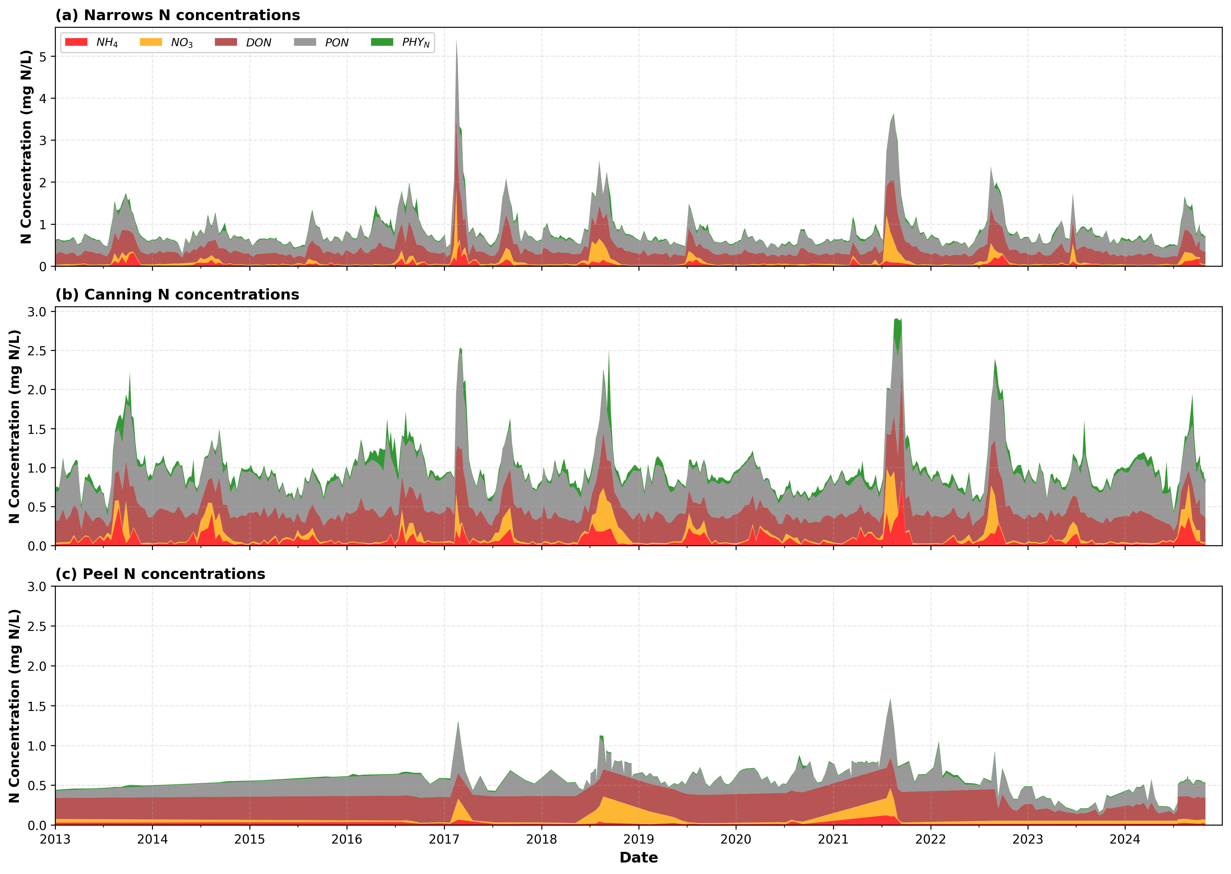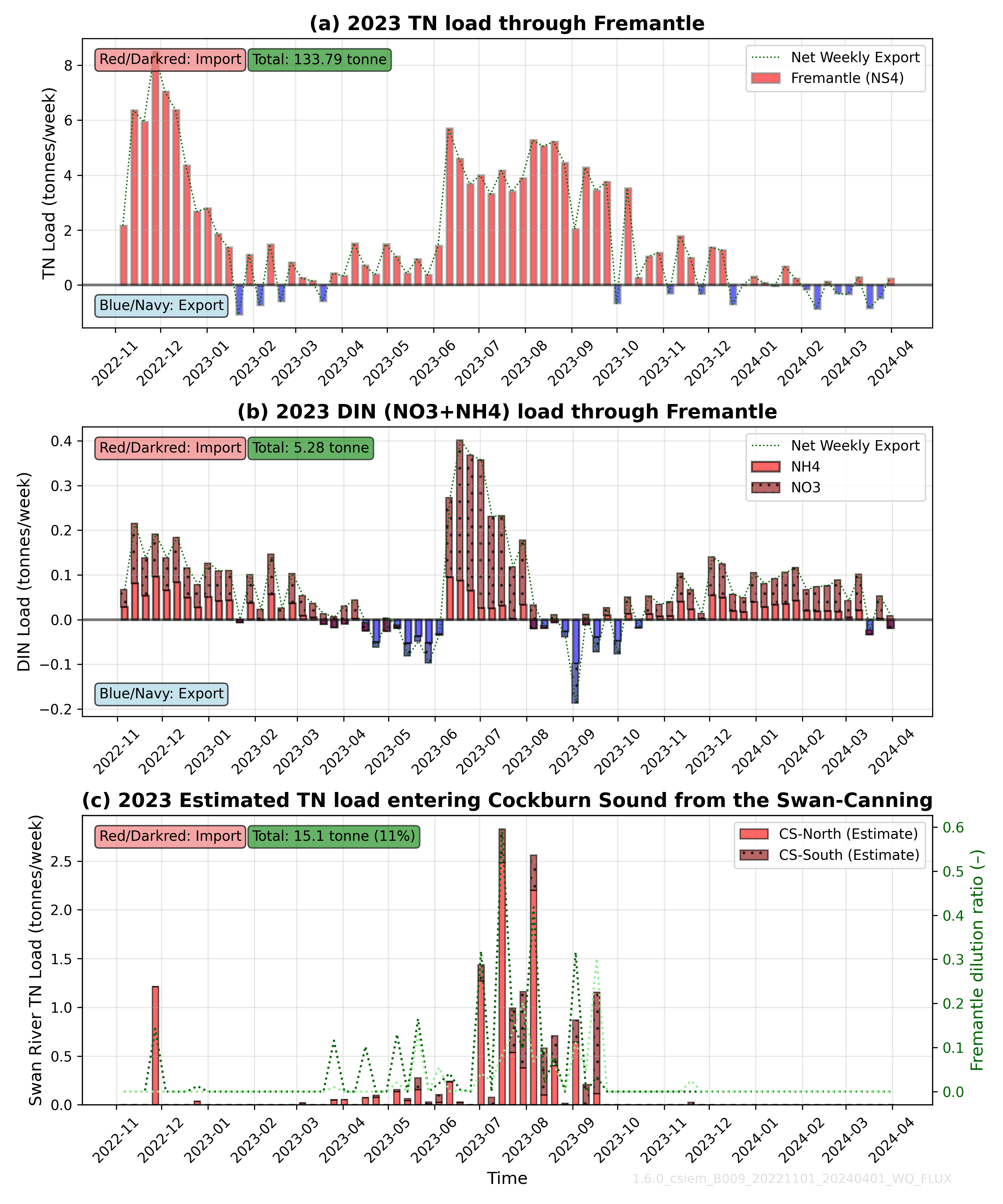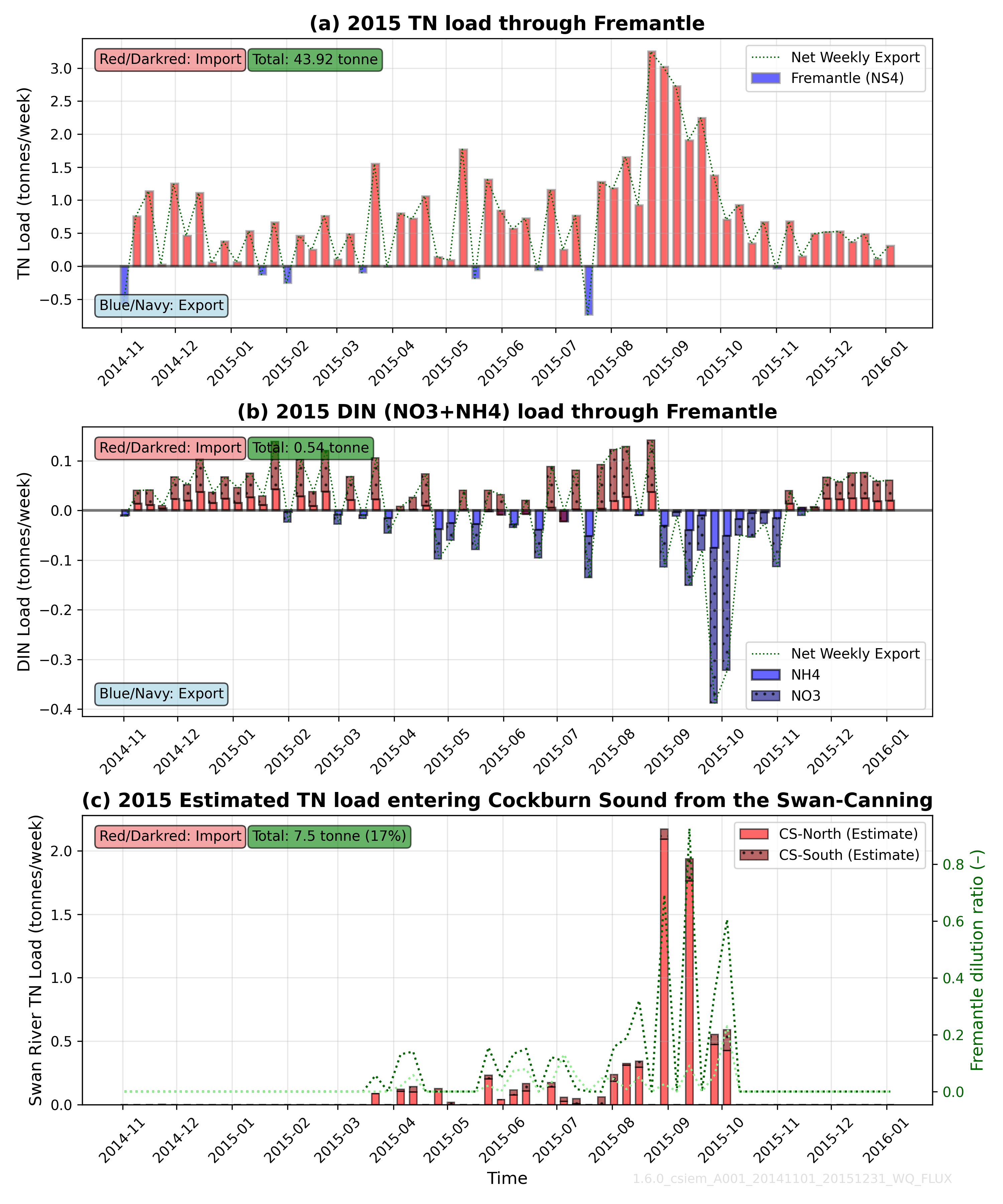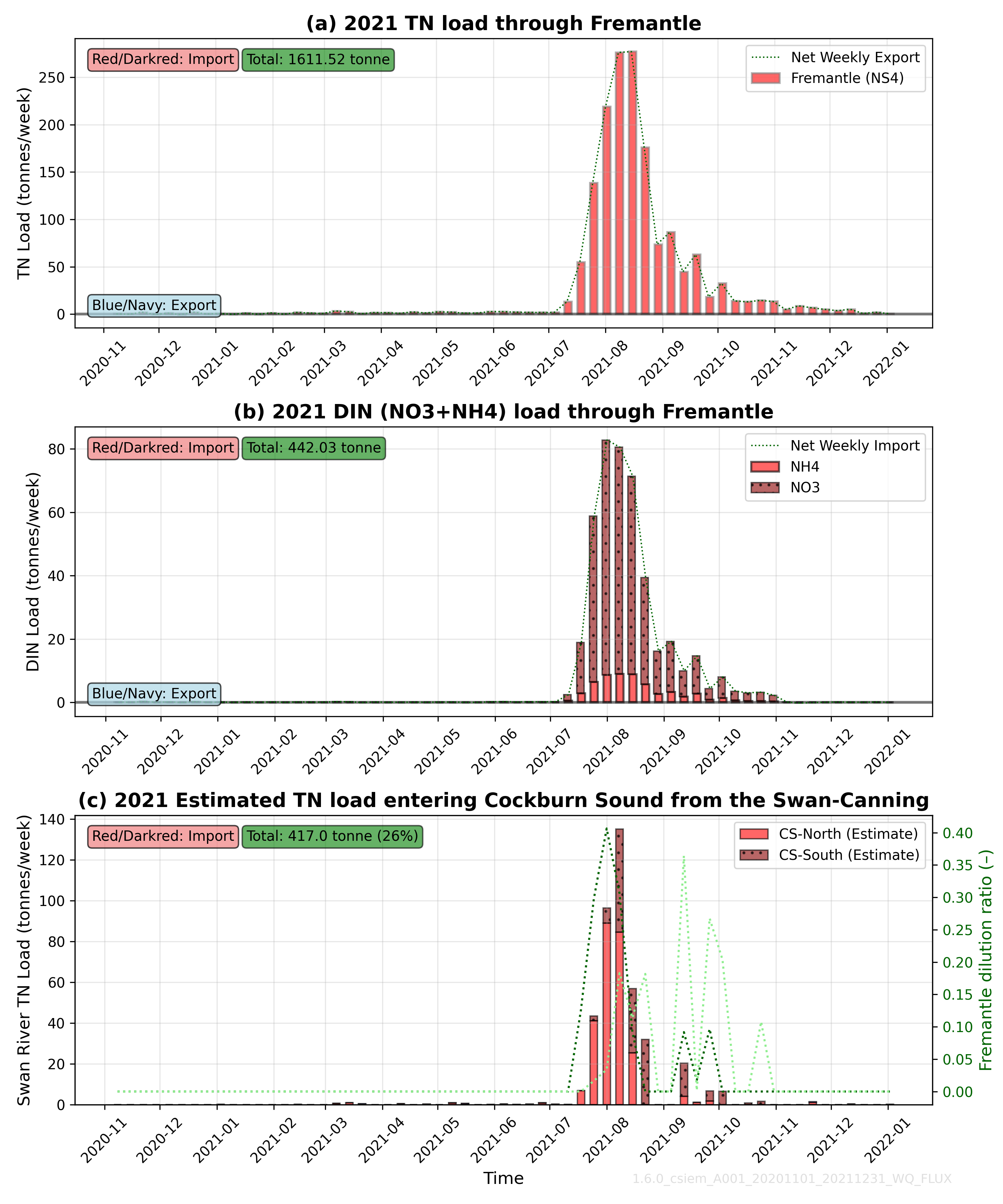 In the previous section, the tracer is used as an indicator of SCE nutrients to show the timing and relative magnitude of SCE waters making it to Cockburn Sound. In this section, we use the modelled flow and simulated nutrient concentrations from the biogeochemical model to compute the actual nitrogen load, enabling us to also consider the form of nitrogen. This is first computed for the water exiting SCE through the Fremantle Port, and then following on from the river tracer analysis, it is possible to also adapt this approach to compute the amount of river-derived nutrients leaving Fremantle that make their way into the main Cockburn Sound embayment (through the Woodman Point to Garden Island transect).