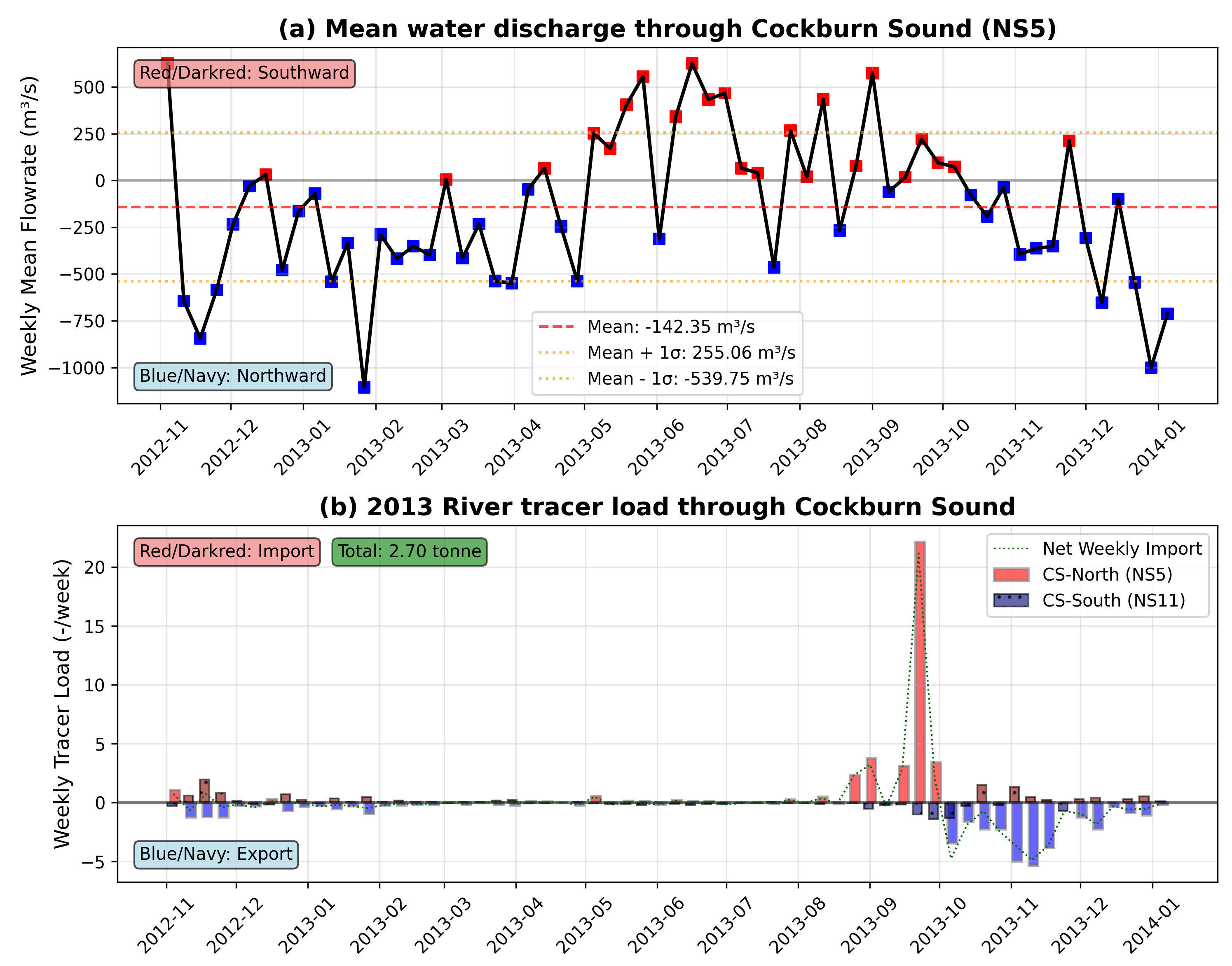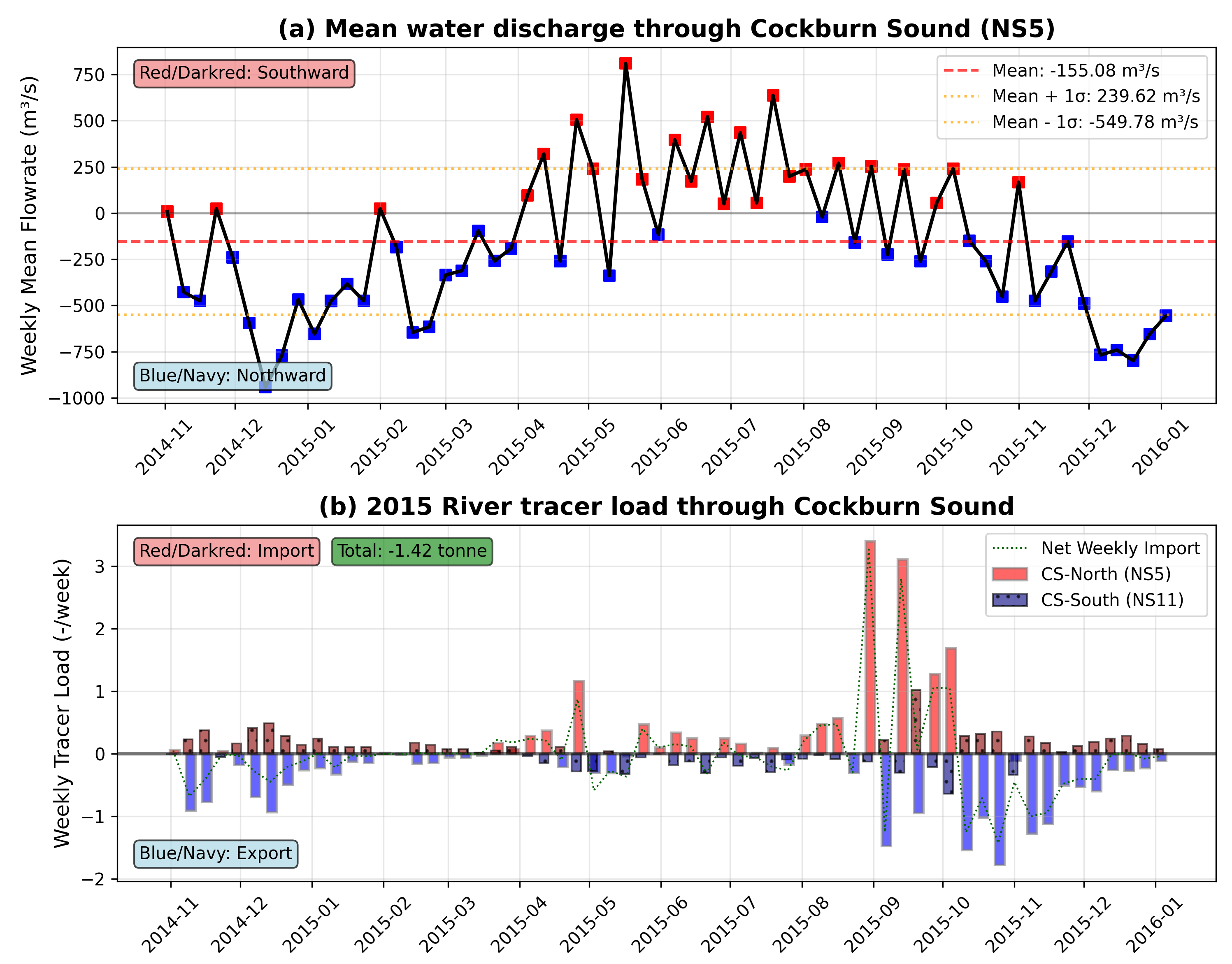 Figure 11.9-ii. River tracer throughflow analysis for the simulated year 2015, showing (a) net water exchange through the CS-North transect, and (b) the weekly “river tracer load” (tonnes/week) moving through CS-North and South, for a river constituent entering the SCE with a hypothetical concentration of \(1\: g/m^3\).
