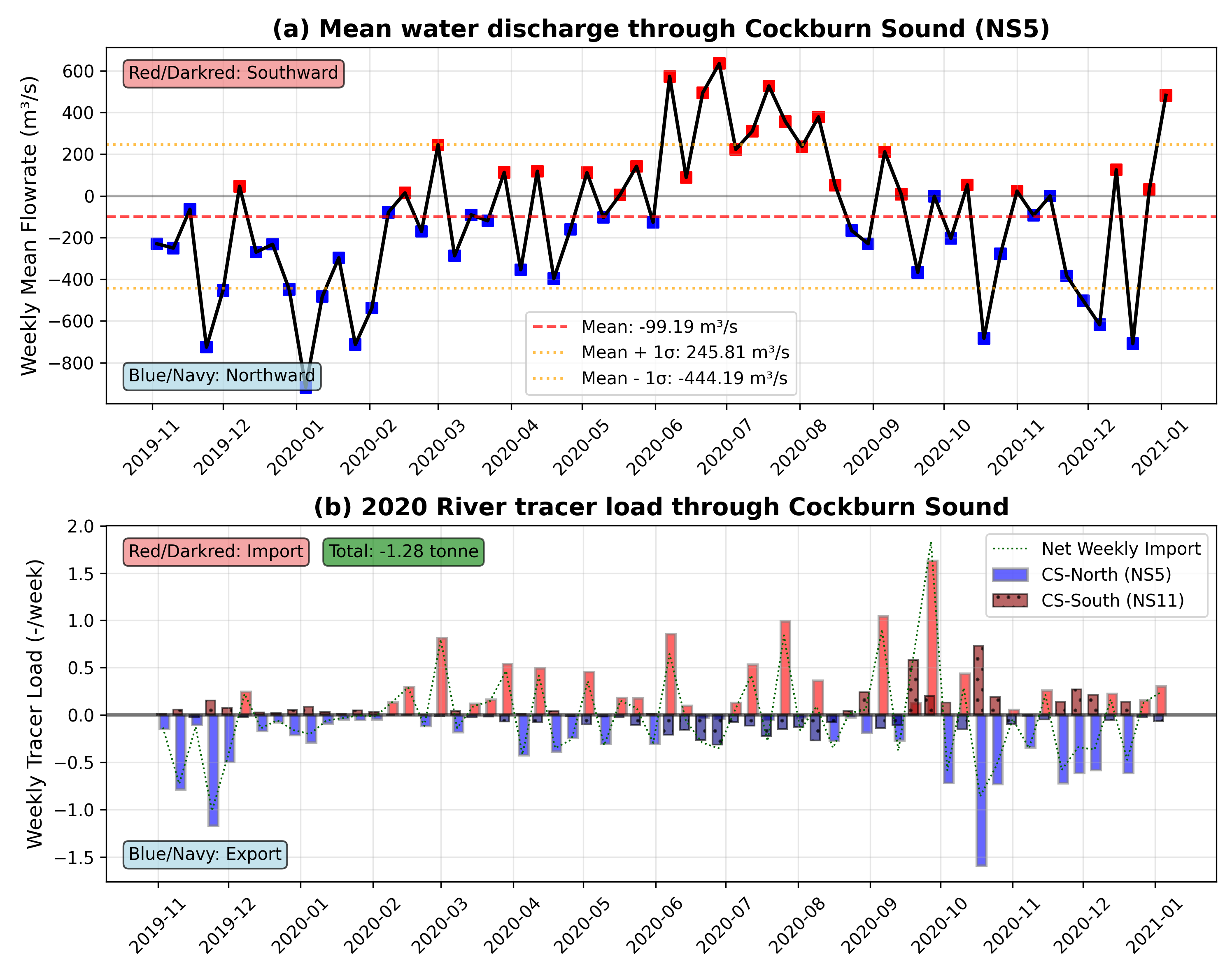 Figure 11.9-iii. River tracer throughflow analysis for the simulated year 2020, showing (a) net water exchange through the CS-North transect, and (b) the weekly “river tracer load” (tonnes/week) moving through CS-North and South, for a river constituent entering the SCE with a hypothetical concentration of \(1\: g/m^3\).