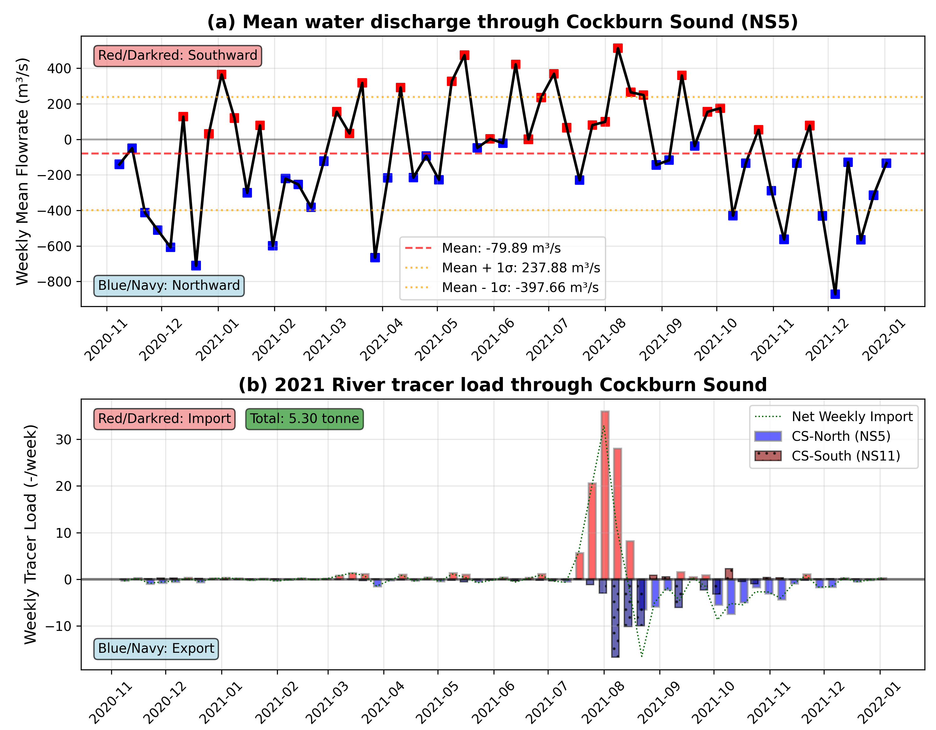 Figure 11.9-iv. River tracer throughflow analysis for the simulated year 2021, showing (a) net water exchange through the CS-North transect, and (b) the weekly “river tracer load” (tonnes/week) moving through CS-North and South, for a river constituent entering the SCE with a hypothetical concentration of \(1\: g/m^3\).