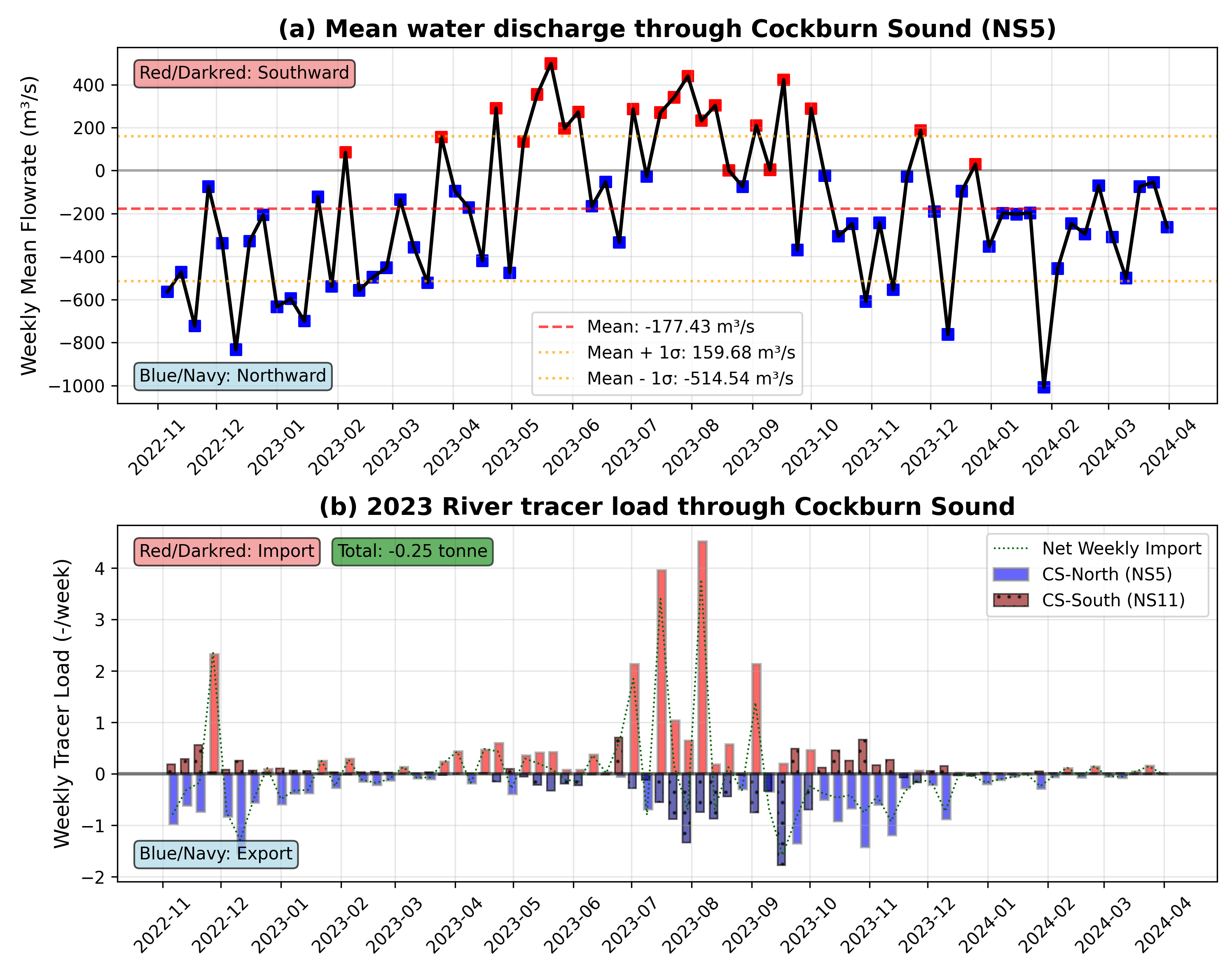 Figure 11.9-vi. River tracer throughflow analysis for the simulated year 2023/4, showing (a) net water exchange through the CS-North transect, and (b) the weekly “river tracer load” (tonnes/week) moving through CS-North and South, for a river constituent entering the SCE with a hypothetical concentration of \(1\: g/m^3\).